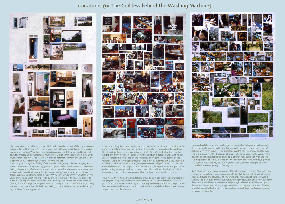 This course gave me the opportunity to explore a completely new direction in what I was doing with photography and resulted in a group exhibition with the other participants at Watershed called Intuitive Visions in 1988. For this show I produced a 3 panel photo-montage/mosaic, with text called ‘Limitations’ using physically cut and pasted photographic prints from the local supermarket photo-lab. This was a visual expression of how I’d come to reject the ‘Transcendental’ approach to photography (the philosophy of the college I had attended) and embrace and celebrate the everyday and the detail of parenthood instead of resenting it and hankering after creating moody landscapes.