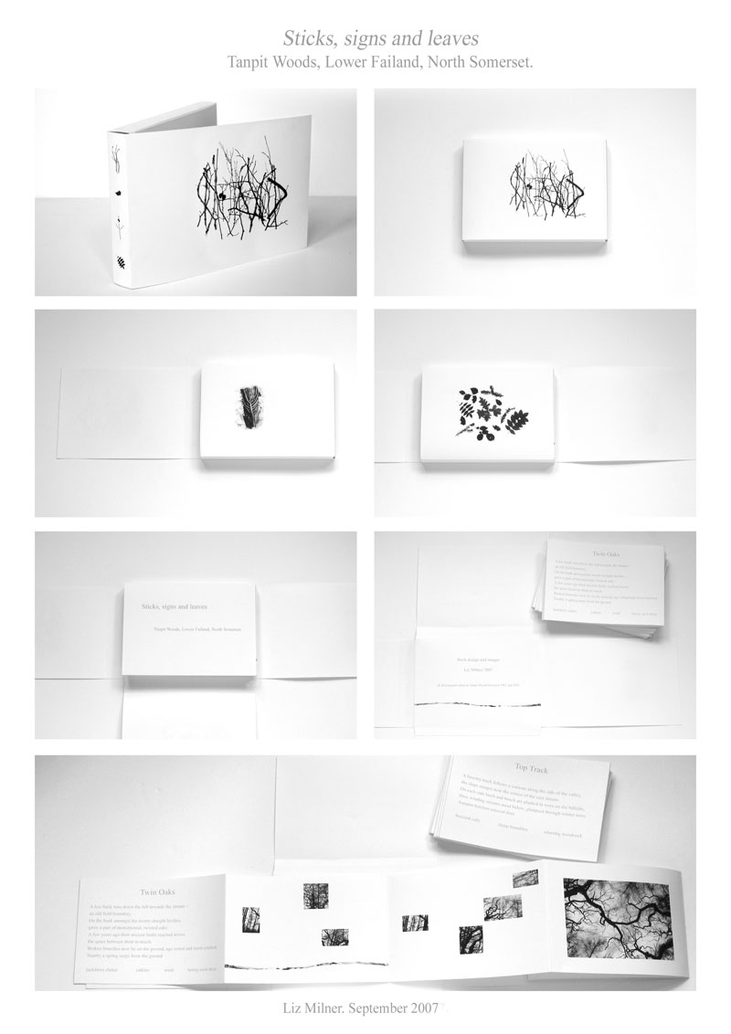 In common with the much of my previous work, this is a kind of inventory of a specific location; but this artefact takes the concept further and attempts to create an analogue of the experience of visiting the woods where the viewer / reader of the book can ‘travel’ around The Woods ‘reading’ the signs that provide the vocabulary of place – the catalogue of the characteristics which makes each area unique and distinctive.