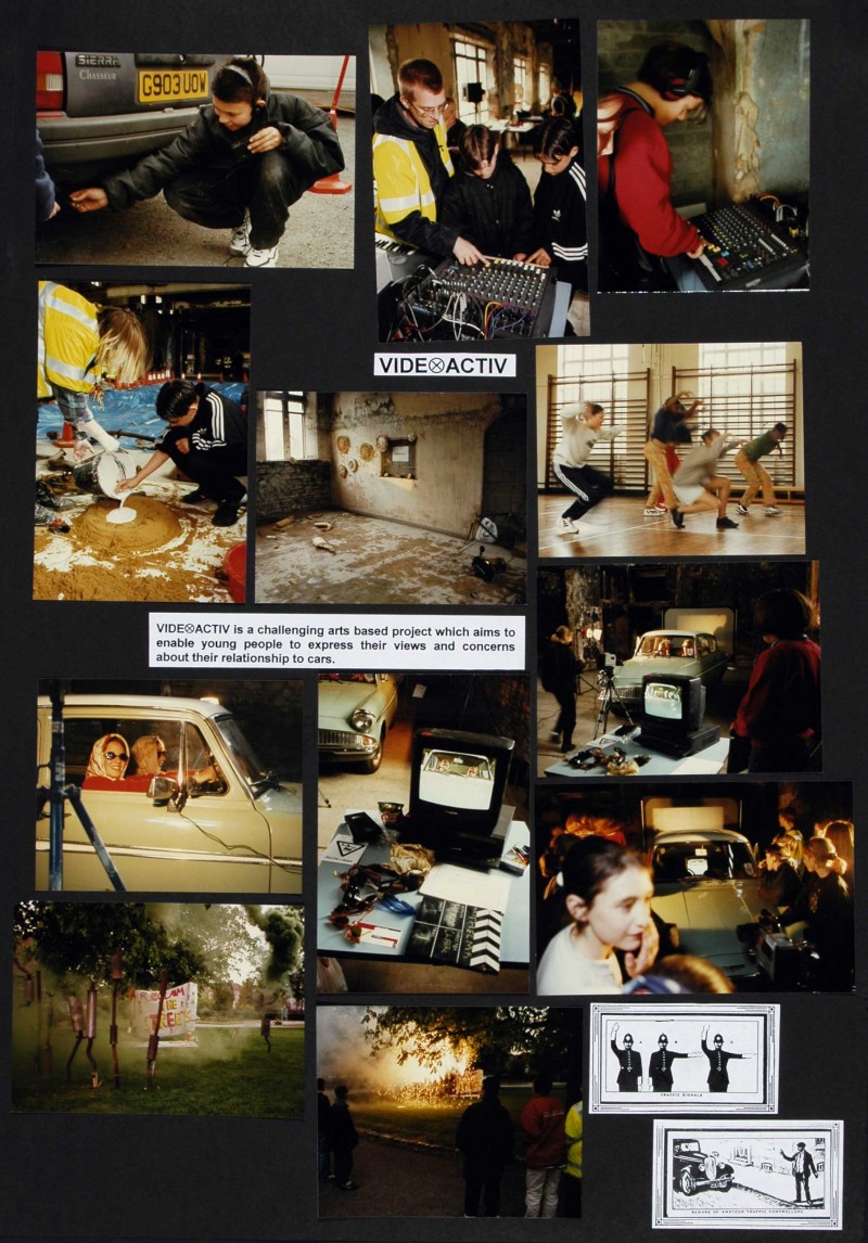 Pre-digital photography record of “Videoactive”, an innovative mixed media workshop for young people held at the Kingswood Foundation, Bristol, investigating their relationships with cars. Activities were led by artists (Winnie Love, Clare Mitchell, Alan May, Fran Bossom and others) and included audio-mixing, video, sculpture, plaster-casting, performance and street dance sessions.