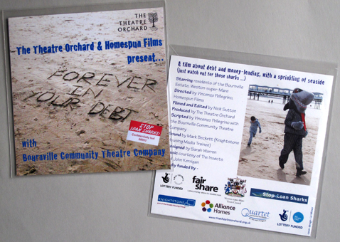 A commission from The Theatre Orchard (formerly Theatre Orchard Project) to design, using and modifying their existing images, a DVD cover and poster for the premiere of a film they’ve co-produced with Homespun Films and the Bournville Community Theatre Company about loansharks and personal debt.