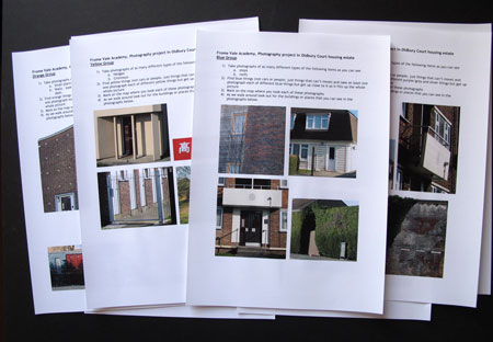 After I’d scrutinised the estate in both the real world and online for features of note I devised a list of themes for the children to look out for and using some of the reference photos I’d taken, along with a street map of the estate, I prepared some ‘clue sheets’ for each group of 3 children.