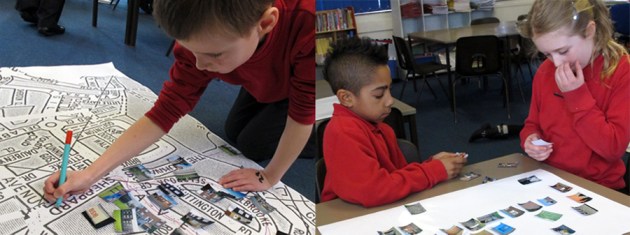 The following week I took in carefully organised and labelled sets of thumbnail prints so the children could work with their own images; they’d clearly engaged with their tasks and produced a detailed record of the areas they’d visited that included a high proportion of excellent photographs. At the start of these final sessions I’d shown each class some examples of the montage posters I’d made about different places (see here and here for examples) and the children created their own quick versions about the estate using the thumbnail photos and the themes they’d been given that helped them see the wide variety of subject matter they’d observed. They also referred to the maps they’d marked up when they were out taking the photos then identified those locations on a larger map and stuck thumbnail prints in (roughly!) the right place.