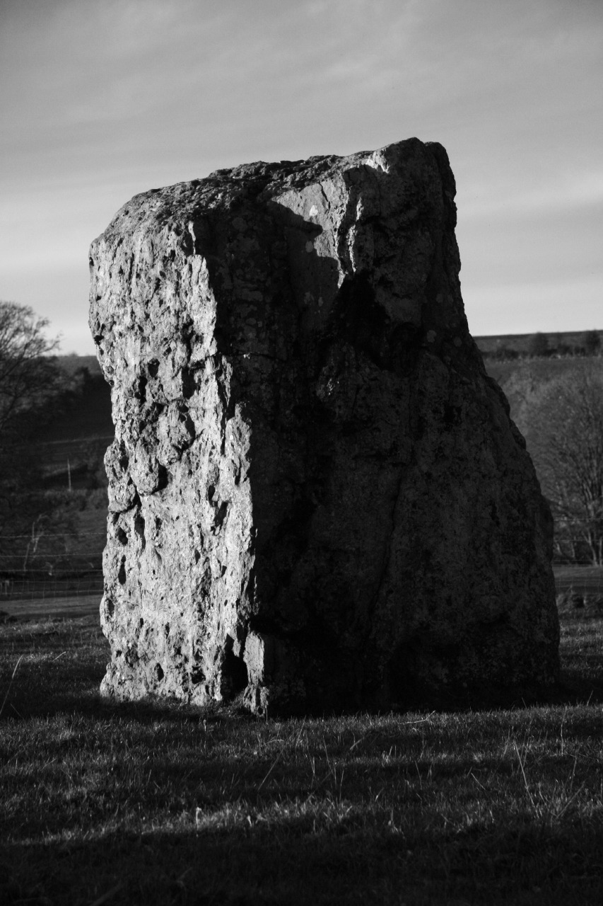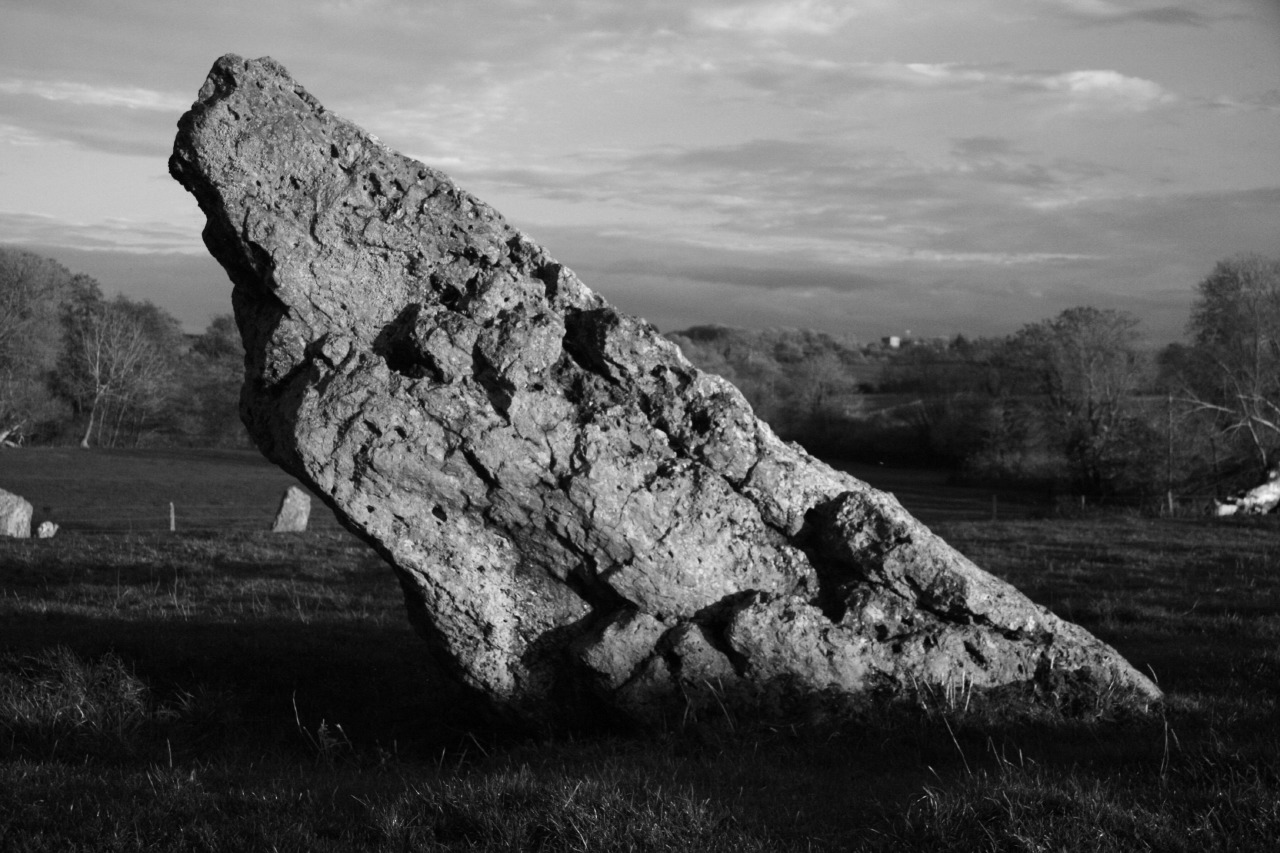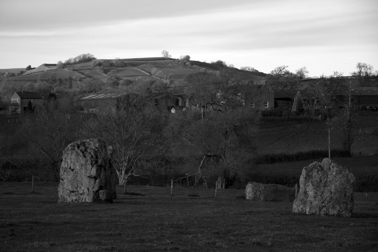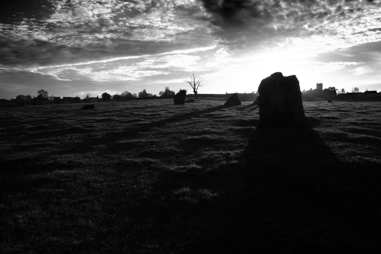 Stanton Drew is a large, but little visited group of three stone circles just south of Bristol set in the fields next to the River Chew; legend has that the stones sometimes go down to the river to drink, they must, after all, be thirsty after all their cavorting – these are wedding guests who were tempted by the devil to carry on dancing into the Sabbath and for their sins were turned to stone. The long ridge of Dundry Hill provides a backdrop to the north that includes the sculpted features of Maes Knoll Iron Age hill fort (see photos at end of post). On the day of our visit it had been dull and grey but brighter weather had been forecast for late afternoon so we set off hoping to catch the last of the sun before dusk.