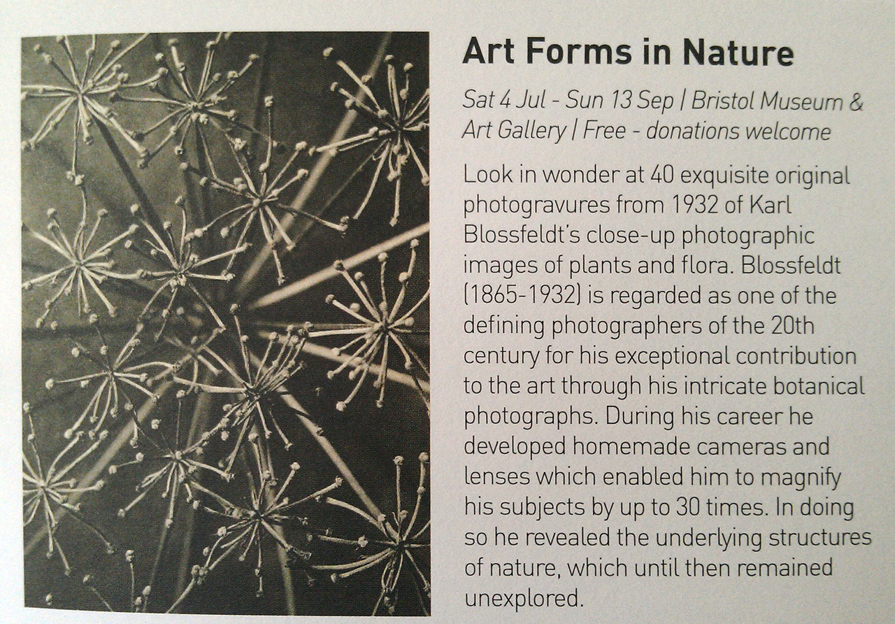 There were one or two references to this in the exhibition (see photos above) and the theme of formal qualities resonated well with the arresting Karl Blossfeld photogravures of natural forms from the 1930s also on display upstairs in the Museum, until Sunday 13th September – no photography allowed but here’s some info and a picture from the flyer to give an idea.