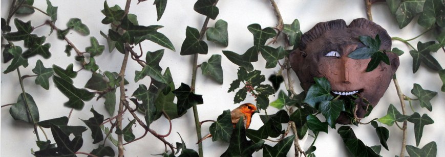 This chimerical mask is made from fired clay, created some years ago by my partner along with some companion pieces; he’s a permanent fixture on the wall above the fireplace, but as a result of a midwinter custom we invented, over the years he’s become a kind of homage to the Green Man. We accidentally initiated this custom out of (mild) despair about 25 years ago in the second winter of living in this house while it was being pulled apart by builders.