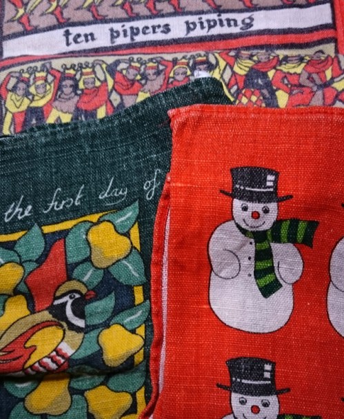 *Tea Towels – As part of her sense of engaging fully with Christmas, and just for a bit of fun, my Mum used to buy Christmas themed tea-towels (depicting the 12 Days of Christmas, snowmen, skating santas etc), which were used by ‘The Men’ who traditionally did the washing up after Christms Dinner. Being a dishwasher-free household we still use the remainder of these faded and thinning cloths, although our boys would comment wryly that it doesn’t make the task any faster or more fun!