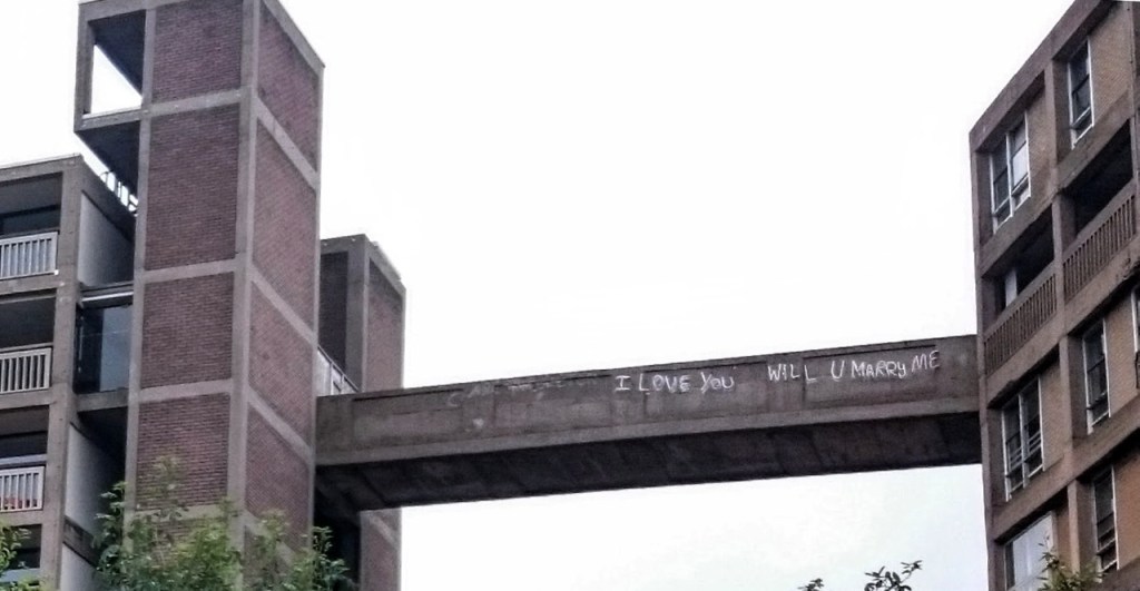 Urban Splash have been responsible for the regeneration of this block and further work is planned on the others, but recession has slowed things down so for now most are still boarded up. It’s a significant feature of Sheffield’s skyline, and such a large potential provision of housing that the city’s residents must hope development will continue. The new-look flats have a view out to their unrefurbished counterparts; although some of the flats are for rent as social housing, many of them are for sale on the open market. See this website for more on the rise, demise and alleged ‘class cleansing’ refurbishment of these buildings and go here to learn the sad story of the infamous grafitti “I love you will you marry me?” on the bridge between two of the buildings (see middle photo above), cynically exploited by a range of companies, individuals and agencies.