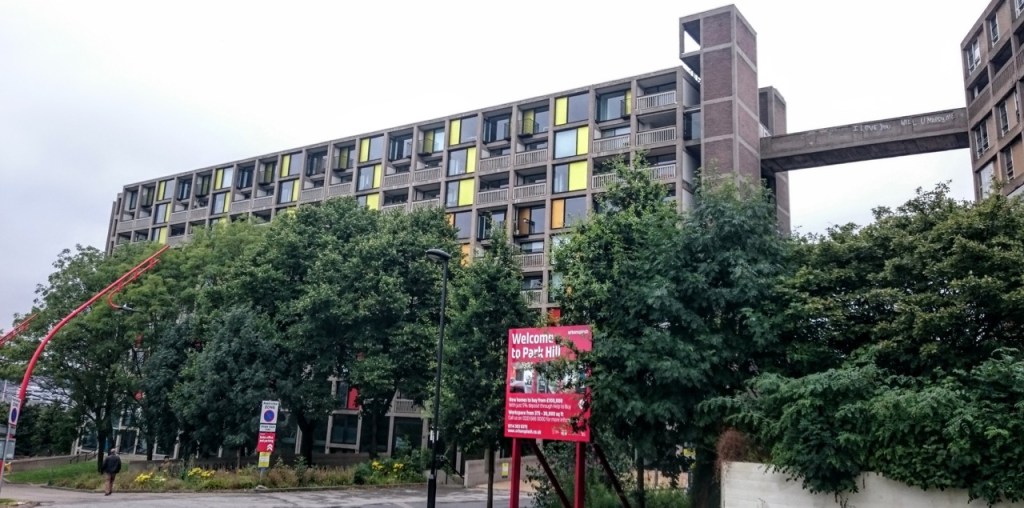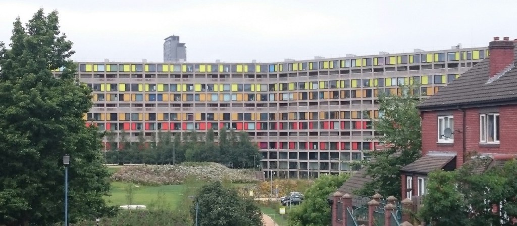 Above: The Park Hill flats (nearly 1000 units) were built in the late 1950s to replace some of Sheffield’s worst housing. When they were completed they provided homes for the people who’d lived in the area and care was taken to rehouse neighbourhoods together, with floor levels named after the old streets. The ‘brutalist’ style accommodation, inspired by Le Corbusier’s Machine for Living was a huge improvement on the houses they replaced and was very popular with the new occupants for some time.