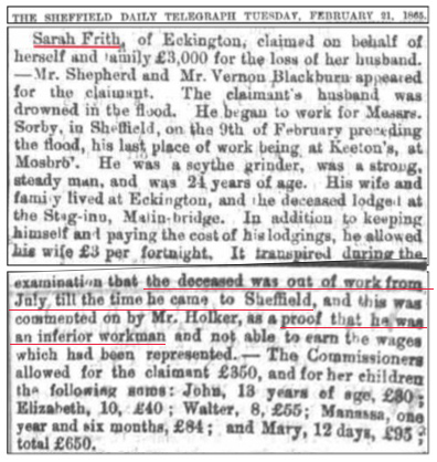 Eventually compensation could be claimed from the Water company by victim’s relatives but was often strongly contested by the board in charge. In James’s case his wife claimed £3000 for herself and her 5 children but was awarded a year later £650; the reason given for the reduced award is shown in this newspaper clipping, below, from 1865 – James had been out of work for 6 months prior to his arrival in Sheffield just 4 weeks before the flood, proof that he must have been ‘an inferior workman’.