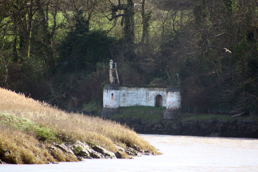 This stretch of river is beneath Ham Green House and there is a mid 18th century folly here known as the Adam and Eve (because of the male and female statues, now much eroded, at each end that have given rise to some colourful stories about two forbidden lovers being separated and locked in the towers and left until they died), which was built by the Bright / Meyler family as a watergate for the house, allowing their ships to stop at high tide for the disembarkation of passengers and unloading of goods.