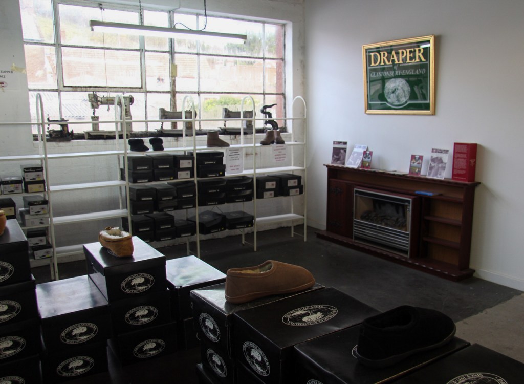 After trekking up the Tor (more of that in this post) we returned to the car but instead of going straight home we succumbed to Draper’s solicitation to view their showroom; there was nothing (we thought) that we needed but curiosity won. After walking up the external staircase and through a frosted glass sliding door we found we’d re-entered the 1970s and the 1930s simultaneously. The factory had the wide windows characteristic of early modern box-frame buildings with the shallow panes and narrow leading giving an expansive but oddly segmented view across the residual flooding on South Moor. But from where we stood, the foreground to this panorama was a shelf of sheepskin slippers and racks and crates of well worn shoe lasts. Behind the racks, the factory floor was illuminated by the windows. This was where they made “1000 pairs of sheepskin slippers and sheepskin boots a week”.