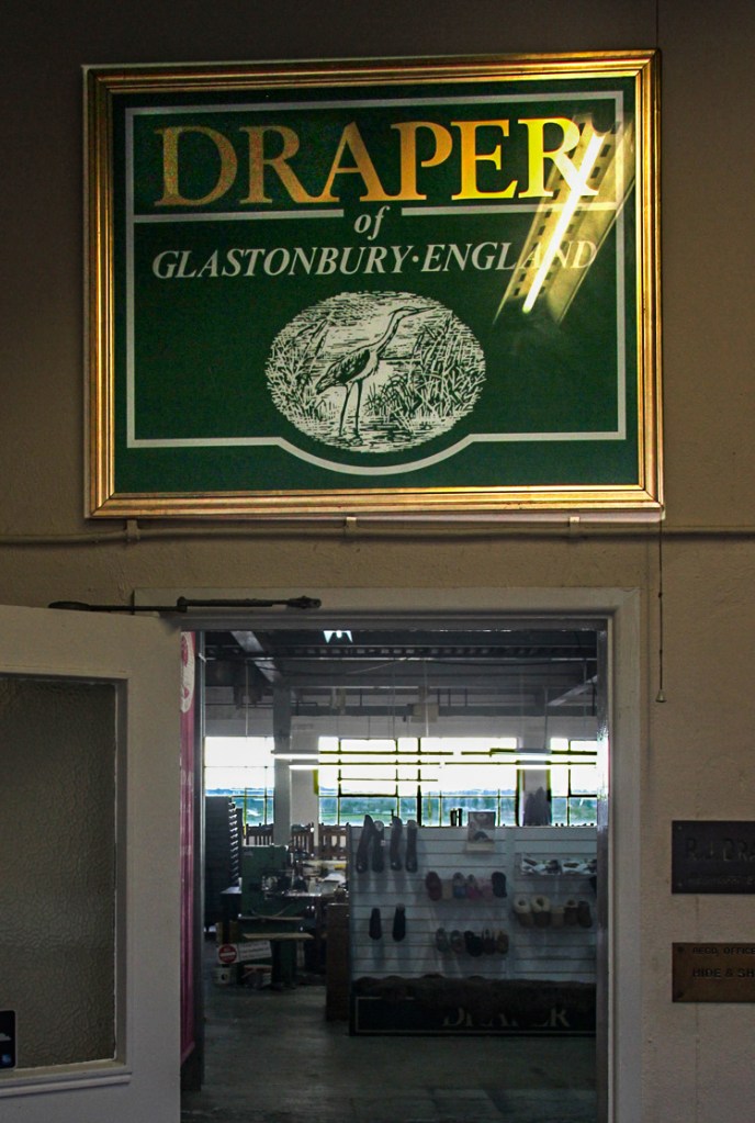 However, we inadvertently re-entered the world of locally produced leather goods on the more recent trip mentioned at the beginning of the post, when we’d gone to climb the Tor on a bright cold day at the end of January; this is where the sheepskin mittens come in! In search of a parking place (never such of a problem in the past) we spotted a sign in the yard behind a slightly tired looking 1930s factory called Draper. It offered £2 parking for the Chalice Well and the Tor, was close to the footpaths and invited visitors to view their sheepskin wares, it seemed a fair offer.